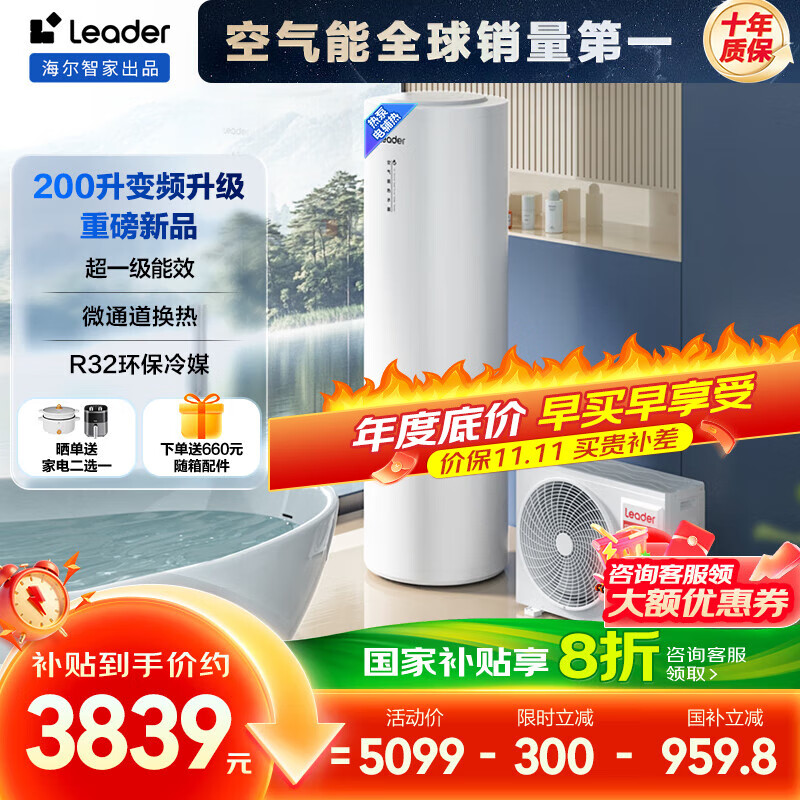 自营海尔(Haier)智家出品Leader 空气能热水器家用200升热泵包安装变频一级能效节能电辅热R32冷媒 LKF200-PF7U1¥4799京东价:¥4799京东配送立即抢购