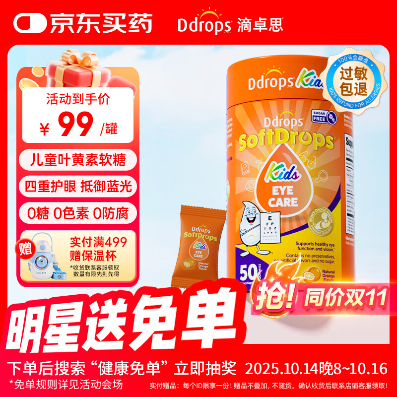 自营Ddrops滴卓思儿童叶黄素软糖复合维生素A护眼软糖营养包零食 50粒/罐¥198京东价:¥198京东配送立即抢购