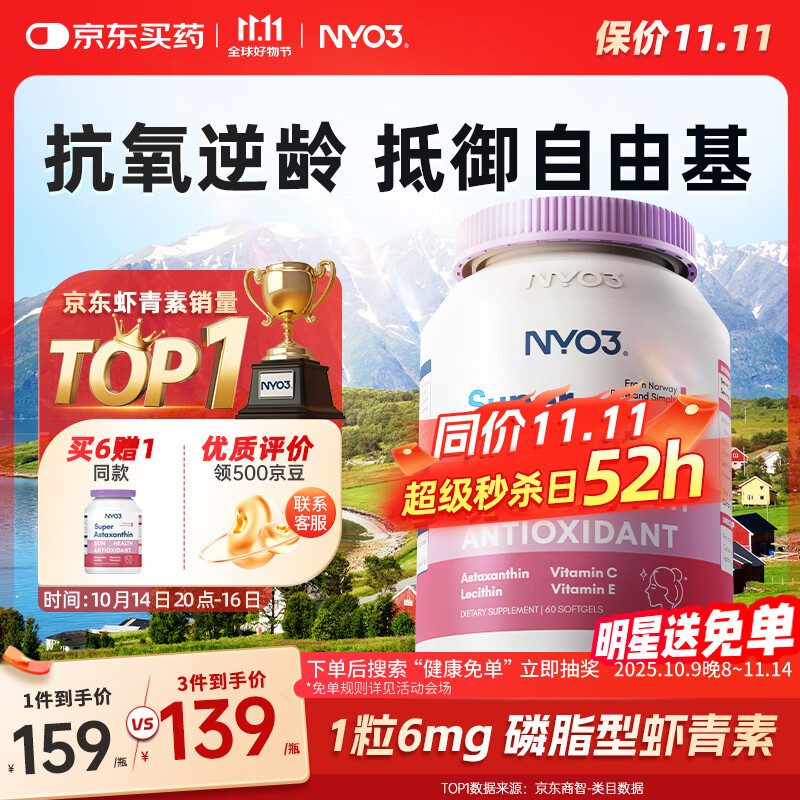 自营NYO3 超级虾青素 6mg 左旋虾青素磷脂VCVE抗氧化抗氧化 60粒/瓶¥299京东价:¥299京东配送立即抢购