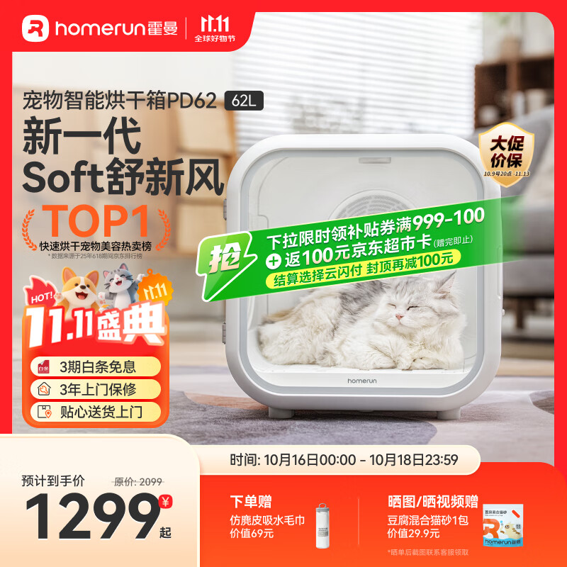 自营霍曼宠物智能烘干箱宠物烘干机猫咪自动吹干箱狗狗洗澡吹风机家用¥1529京东价:¥1529京东配送立即抢购