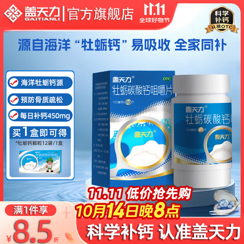 [盖天力]牡蛎碳酸钙咀嚼片 0.15g*60片 1盒装 中老年人补钙钙片 骨质疏松碳酸钙片适用于青少年儿童补钙女士孕妇蚝贝钙片¥56.29京东价:¥56.29高收益榜立即抢购
