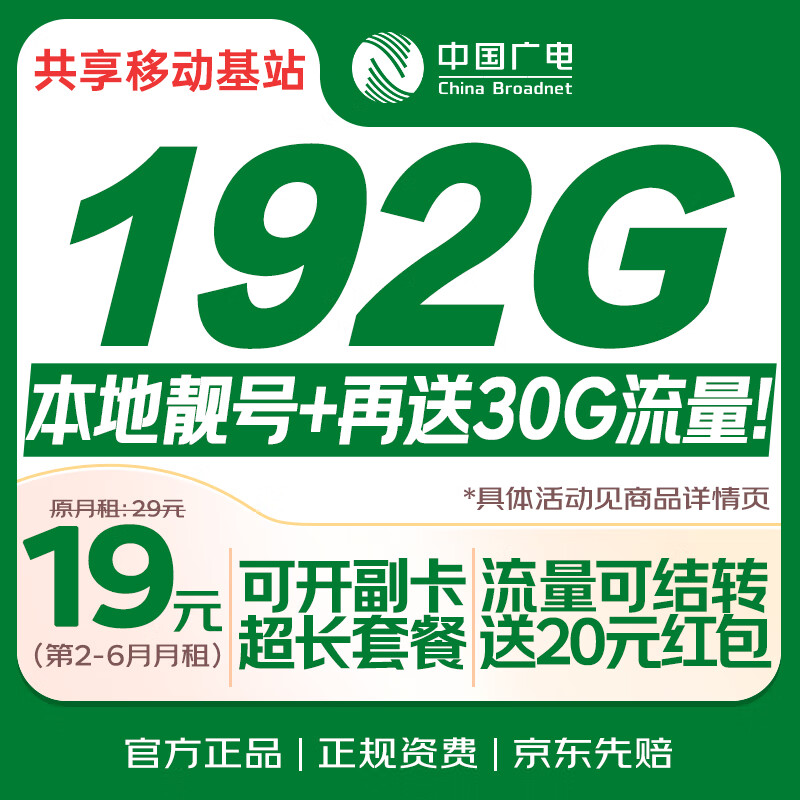 自营中国广电流量卡19元【自选靓号】长期手机卡全国通用电话卡5G移动基站信非永久无限¥0.01京东价:¥0.01高收益榜立即抢购