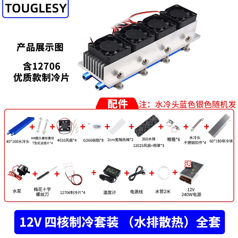 12V半导体制冷片套装成品降温电子制冷器成品小空调冰箱diy水冷头导冷套件 (散件)12V四核制冷套装(水排散热)全套
