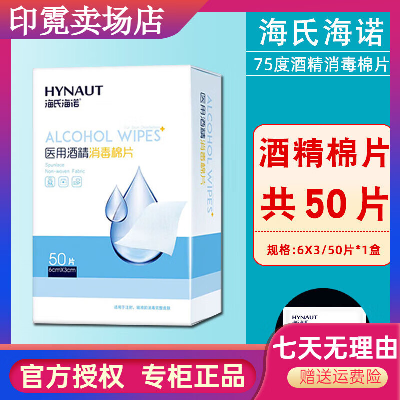 海氏海诺医用酒精棉片一次性擦手机耳洞清洁75%酒精湿巾办公家用湿纸巾 6X 6X3cm【50片X1盒】共50片