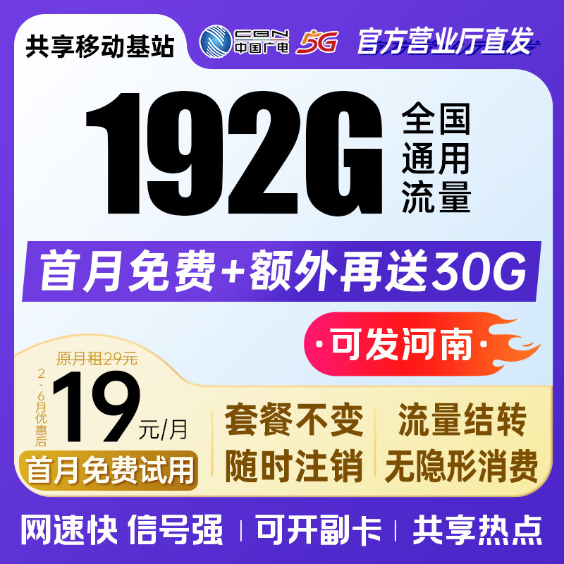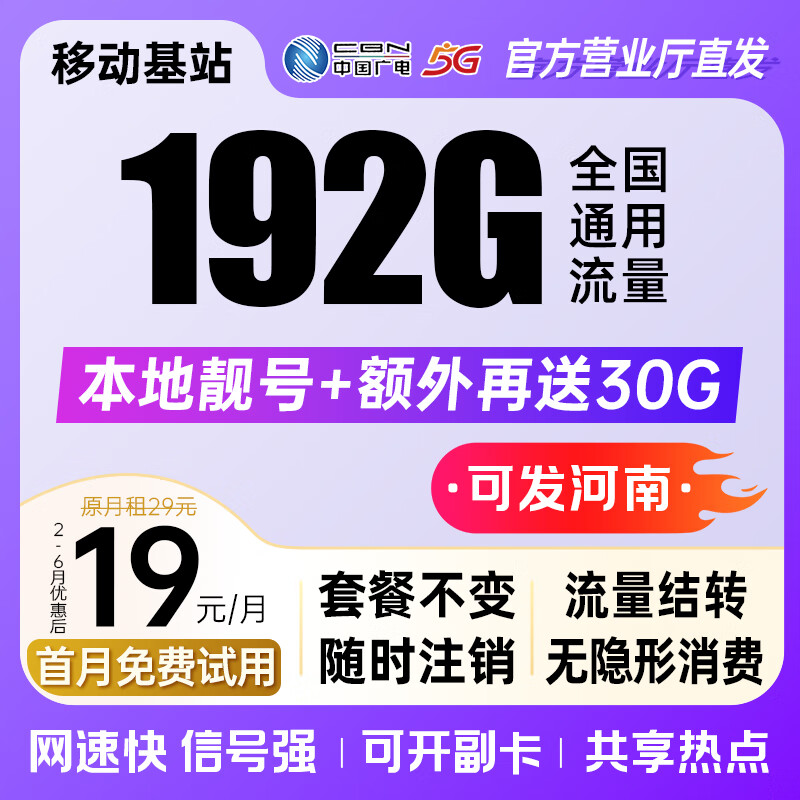 中国广电流量卡电话卡纯上网卡手机卡升卿卡19元月租全国通用无合约套餐大王无限流量 本地选号卡*192G/月19元*流量结转+首月免费无线¥0.015000条评论返56%直达链接复制推广