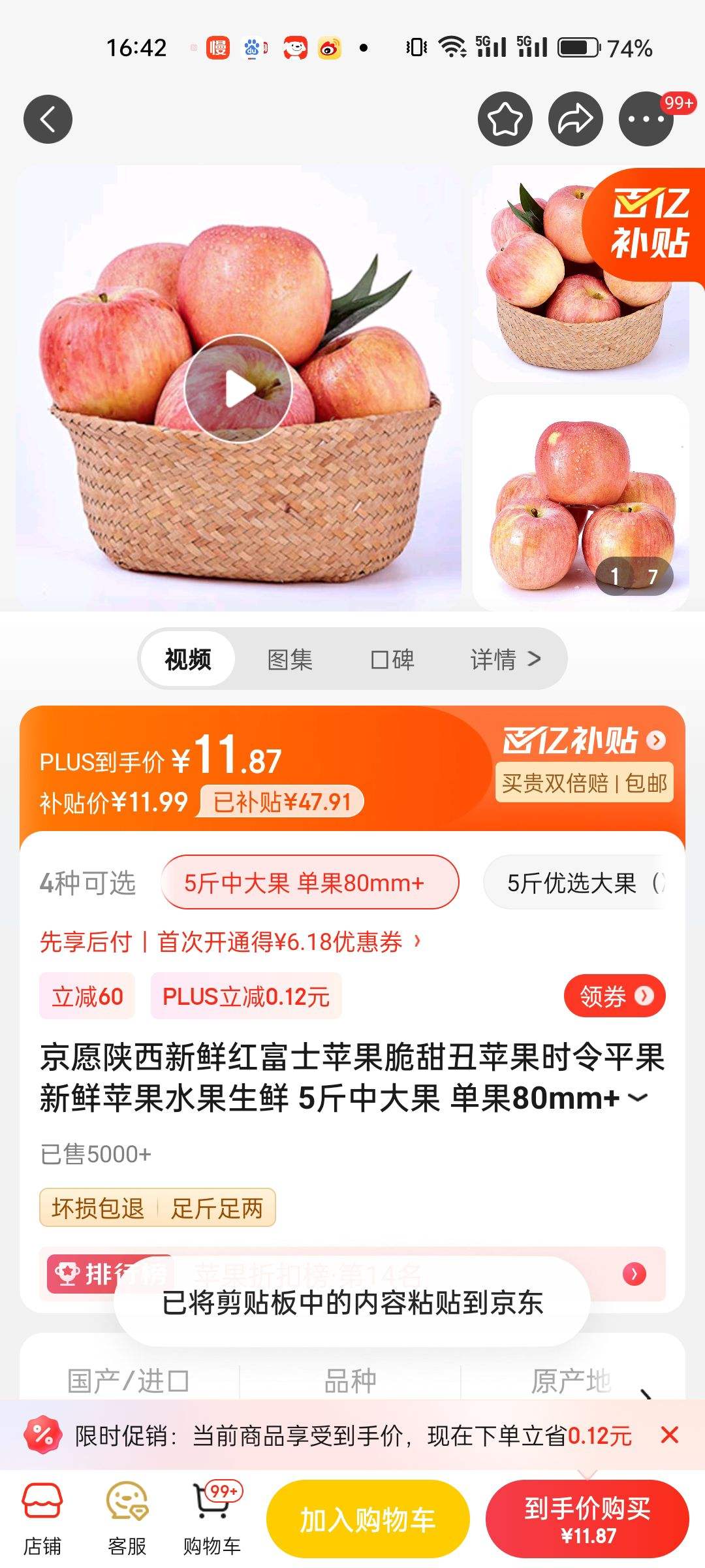 pLus会员:京愿陕西新鲜红富士苹果脆甜丑 5斤中大果 单果80mm+ 11.87元
