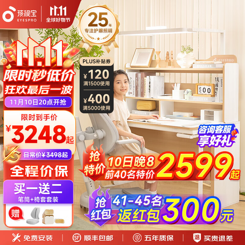 EYESPRO 孩视宝 儿童学习桌中小学生阳光桌椅套装G+105W护眼灯 105*60*156.5cm单桌(免费送装) 券后3348元