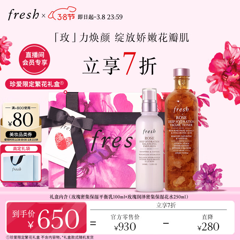 京东PLUS:fresh 馥蕾诗 玫瑰密集保湿护肤套装(平衡乳100ml+保湿花水250ml) 443.5元