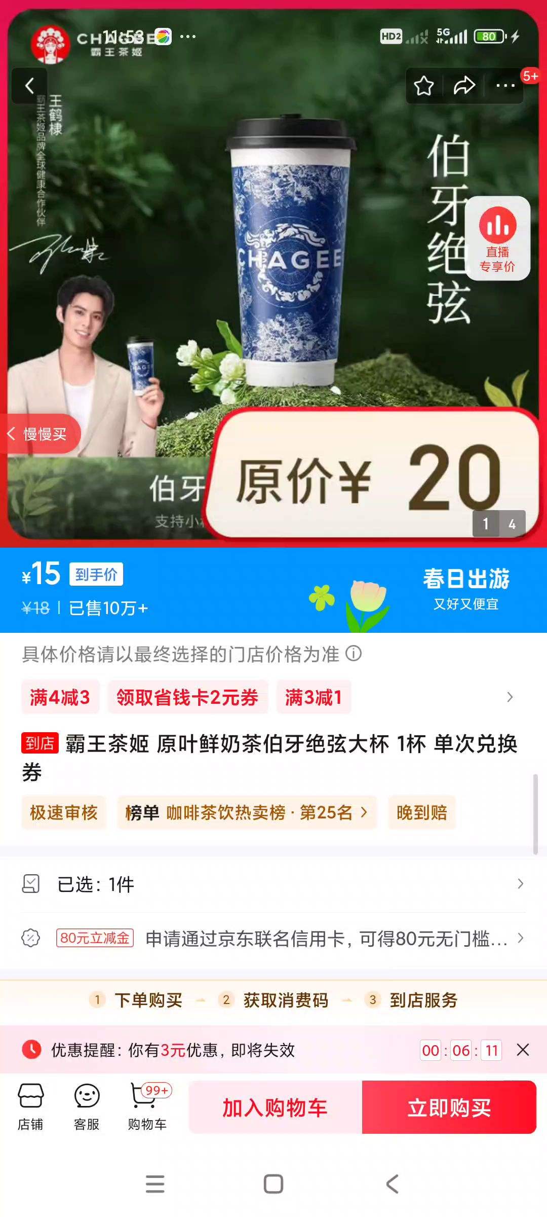 京东商城  CHAGEE霸王茶姬官方旗舰店  ,商品面价18元