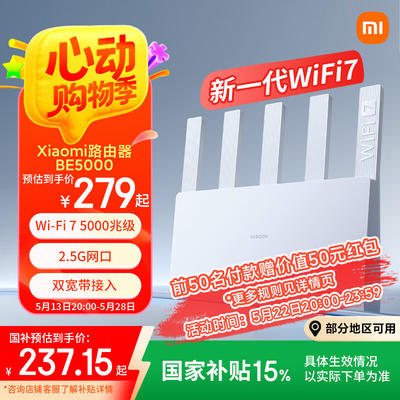 京东PLUS、限地区:小米 Xiaomi BE5000 5000Mbps 家用千兆无线路由器 Wi-Fi 7 2.5G 双宽带接入 券后164.72元