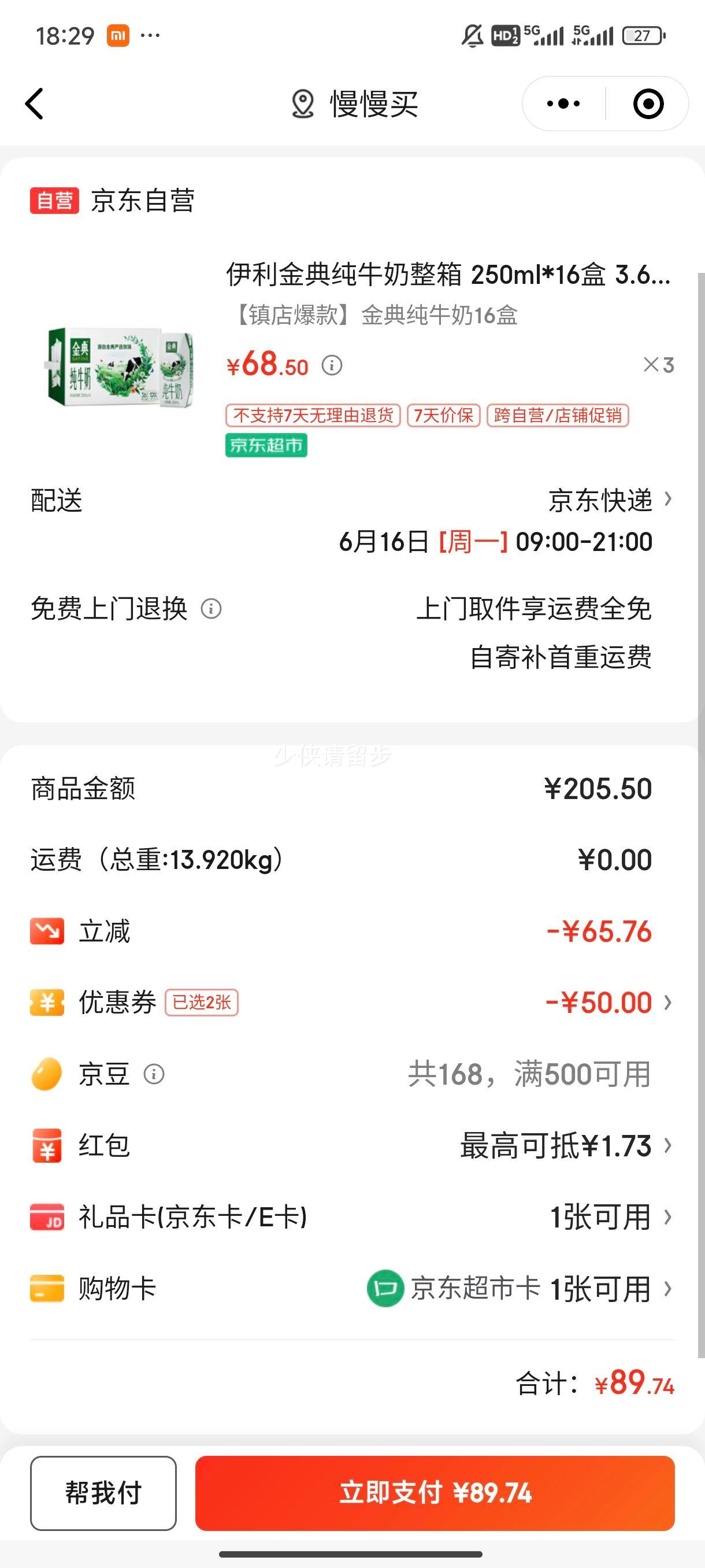 伊利牛奶京东自营旗舰店 ,商品面价100元